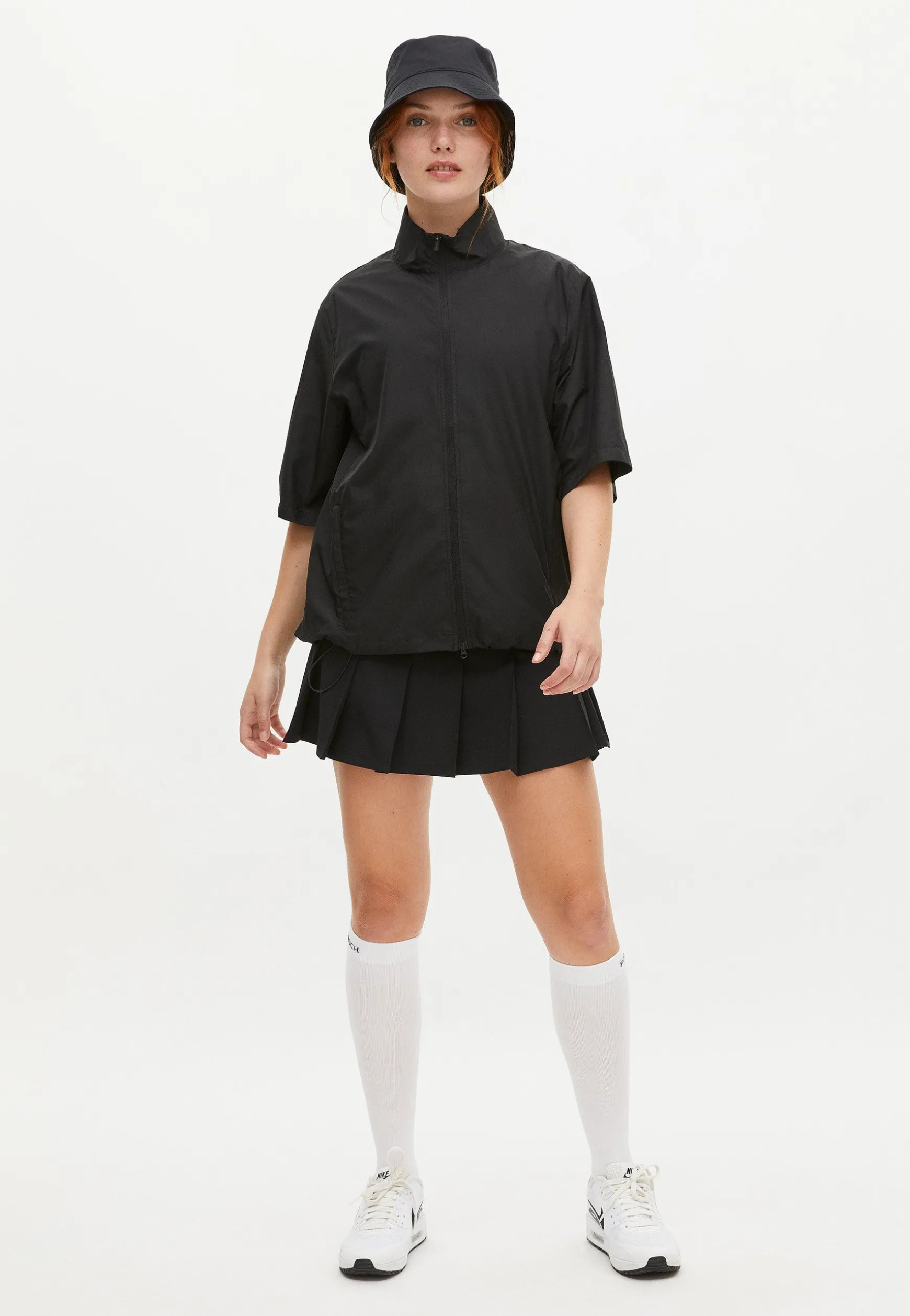 Made in a light, wind resistant and 100% recycled polyester. Designed with the ability to pack the top down in one of the pockets, and with details such as zip pockets in the front as well as an adjustable drawstring at the bottom hem. Regular fit.